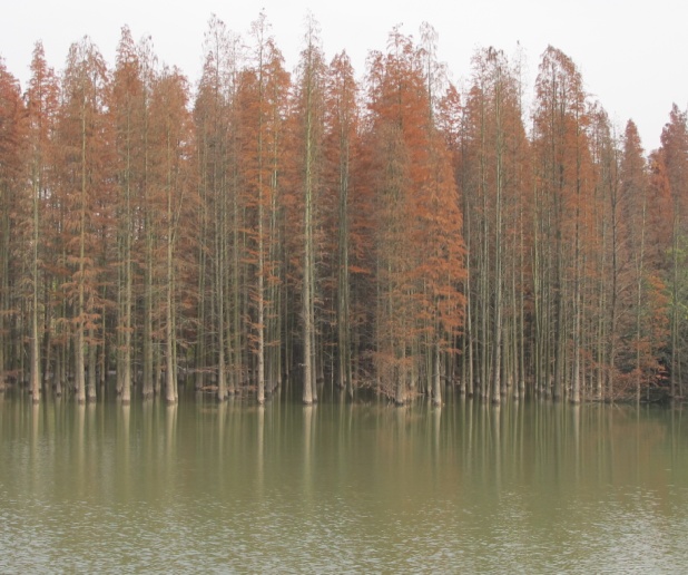 隨著船我們到了第二站“水上森林”,湖面上的水杉更是讓人目不轉(zhuǎn)睛,雖已是初冬,秋天的顏色卻還沒有完全褪去。筆直的水杉,平靜如鏡的湖面是那么的和諧,那么的安靜,同事們都被眼前的美景吸引,也為這份寧靜所震撼。
